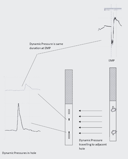 This Dynamic pressure is induced in a blast hole by the detonation of earlier fired holes. The velocity of propagation increases and the peak pressure level decreases with an increase in ground hardness. Pressure is readily transmitted by water and clay seams with key features of the pressure pulse being: