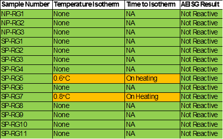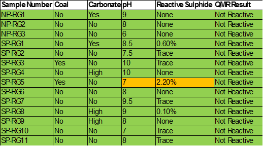 Prior to testing as per the AEISG Code of Practice each sample was assessed for reactivity risk based on pH, carbonate and amount of reactive sulphide using the QMR Reactive Ground Test (refer to Table 1 and Table 2 for results of both tests). One samples, SP-RG5 contained more than trace level of reactive sulphide of 2.2%. The pH of sample SP-RG5 was 7 and at this level of pH the coal also contained in the sample inhibited a reaction when tested as per the AEISG Code of Practive.