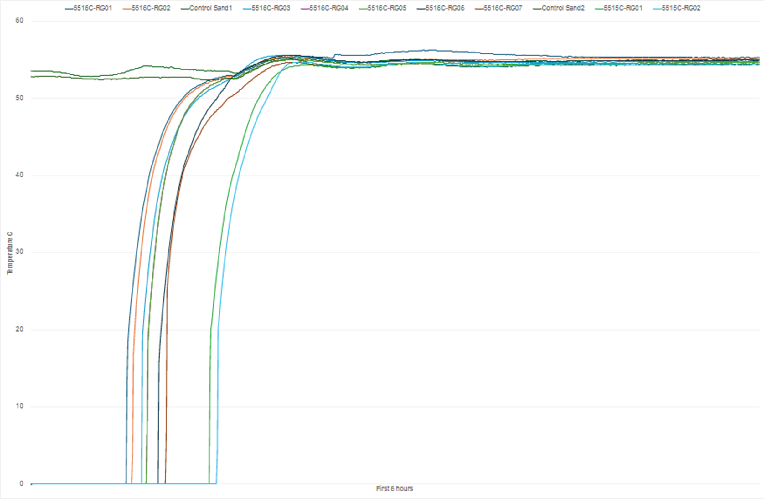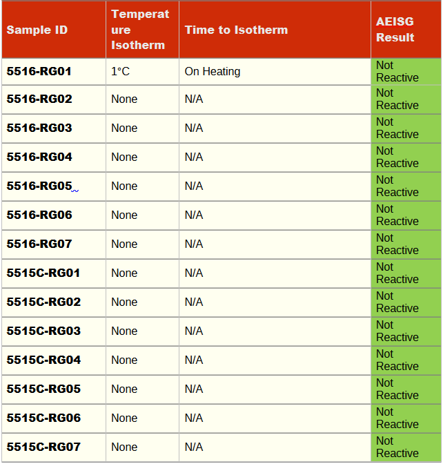 The results for the screening test are shown in . The AEISG classifies a sample as reactive if it exceeds the background temperature of the sample by 2 degrees centigrade or more throughout the entire test duration. It is difficult to determine if a difference of 2 degrees has occurred during the heating phase of the test. The temperature trace for each sample is studied independently to observe for any evidence of an exothermic reaction. Charts of the sample temperature traces are shown in Appendix A.