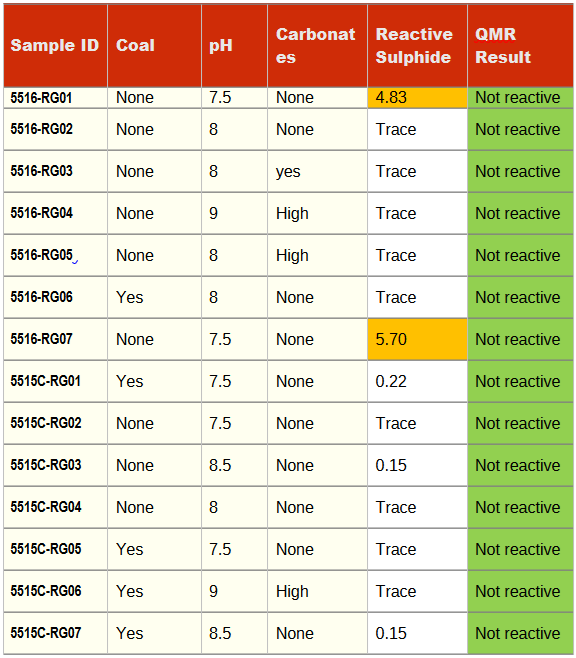 The QMR Test incorporates the role of environmental factors that could impact the reactivity result. Coal and carbonates can act to inhibit the reaction. The pH is measured, as acidity is strongly correlated with reactivity. As the reaction between ammonium nitrate and sulphides is caused primarily reactive sulphides, the presence of reactive sulphides is tested. The results from the QMR Test are listed in with only sample 5516C-RG01 and 5516C-RG07 containing more than trace reactive sulphide with a pH of 7.5 inhibiting (or limiting the reaction in the case of sample 5516-ER01) a reaction. These samples are a risk for a hot ground event (refer to risk Matrices).