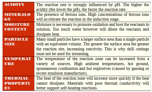 In a mining environment there will be multiple minerals and chemicals that act to inhibit or catalyse the reactivity of ammonium nitrate and sulphides. While water is necessary for the reaction to occur, too much water can dissolve the reactant products and dissipate heat, slowing or preventing the reaction from occurring. It is important to understand the reactions that are taking place to best apply your test results to your site, however it is prudent from a risk management perspective to assume the worst-case environment and mitigate the risk of a reactive ground event via comprehensive risk management.