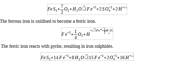 Where pyrite exists, it is therefore possible that the following reagents will have accumulated: pyrite, sulfuric acid, ferric and ferrous sulphates. This is the same process that causes acid my drainage.