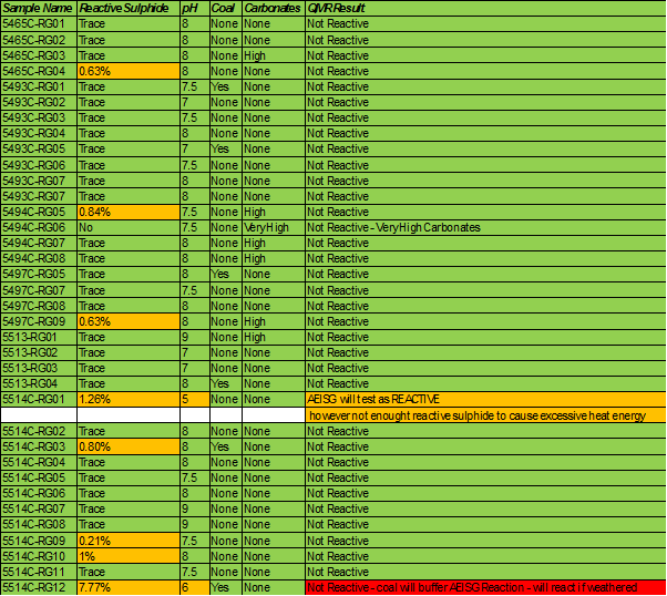Prior to testing as per the AEISG Code of Practice each sample was assessed for reactivity risk based on pH, carbonate and amount of reactive sulphide using the QMR Reactive Ground Test (refer to Table 1 and Table 2 for results of both tests). Eight of the 37 samples contained more than trace reactive sulphide with 3 sample containg ≥ 1% reactive sulphide as described in Table 3. All samples tested at not reactive as per the AEISG code practive, however the QMR test identifies that sample 5514C-RG12 has the potential to become reactive if weathered.