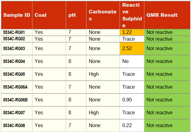 The QMR Test incorporates the role of environmental factors that could impact the reactivity result. Coal and carbonates can act to inhibit the reaction. The pH is measured, as acidity is strongly correlated with reactivity. As the reaction between ammonium nitrate and sulphides is caused primarily reactive sulphides, the presence of reactive sulphides is tested. The results from the QMR Test are listed in Table 2 with only sample 5534C-RG01 and 5534C-RG03 containing more than one percent reactive sulphide. These samples are a risk for a hot ground event (refer to risk Matrices).