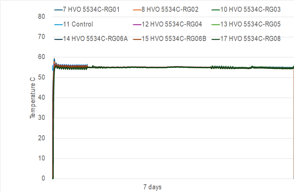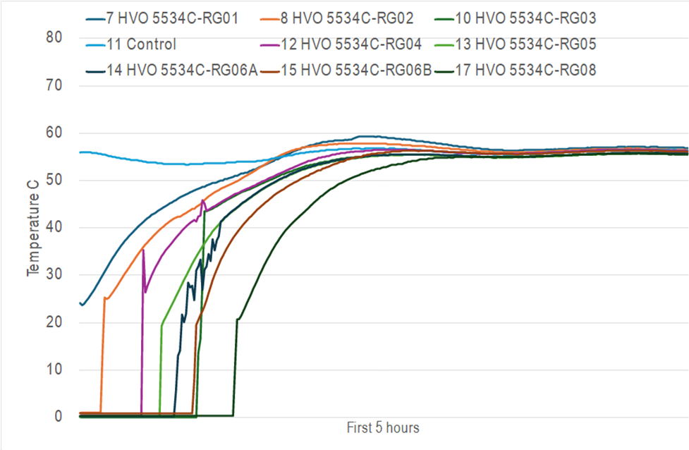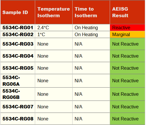 The results for the screening test are shown in Table 1. The AEISG classifies a sample as reactive if it exceeds the background temperature of the sample by 2 degrees centigrade or more throughout the entire test duration. It is difficult to determine if a difference of 2 degrees has occurred during the heating phase of the test. The temperature trace for each sample is studied independently to observe for any evidence of an exothermic reaction. Charts of the sample temperature traces are shown in Appendix A.