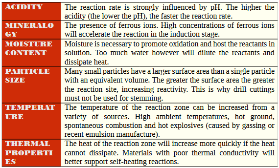 In a mining environment there will be multiple minerals and chemicals that act to inhibit or catalyse the reactivity of ammonium nitrate and sulphides. While water is necessary for the reaction to occur, too much water can dissolve the reactant products and dissipate heat, slowing or preventing the reaction from occurring. It is important to understand the reactions that are taking place to best apply your test results to your site, however it is prudent from a risk management perspective to assume the worst-case environment and mitigate the risk of a reactive ground event via comprehensive risk management.