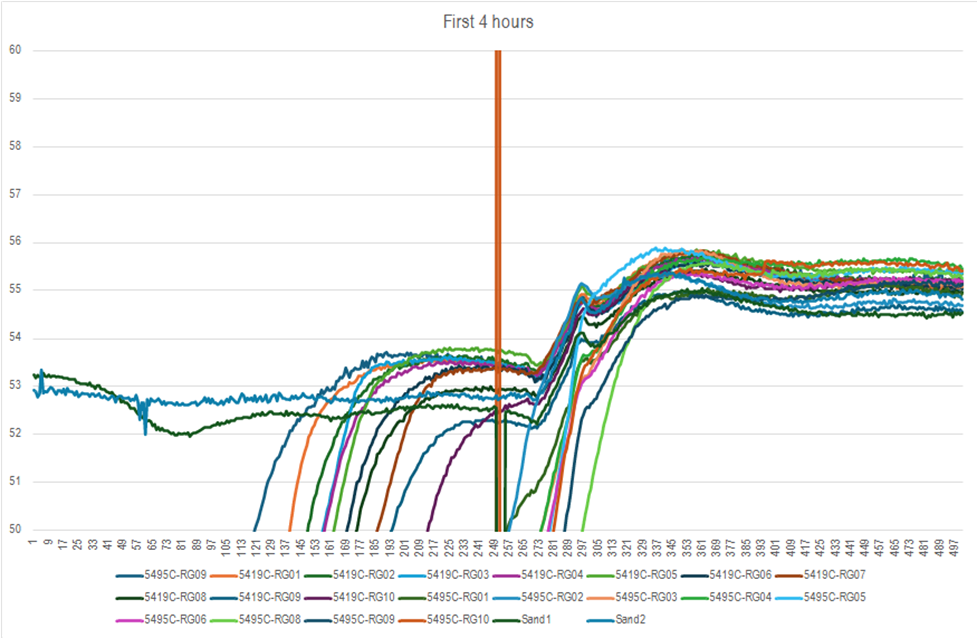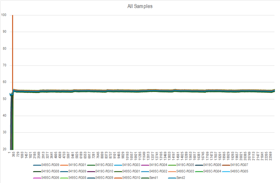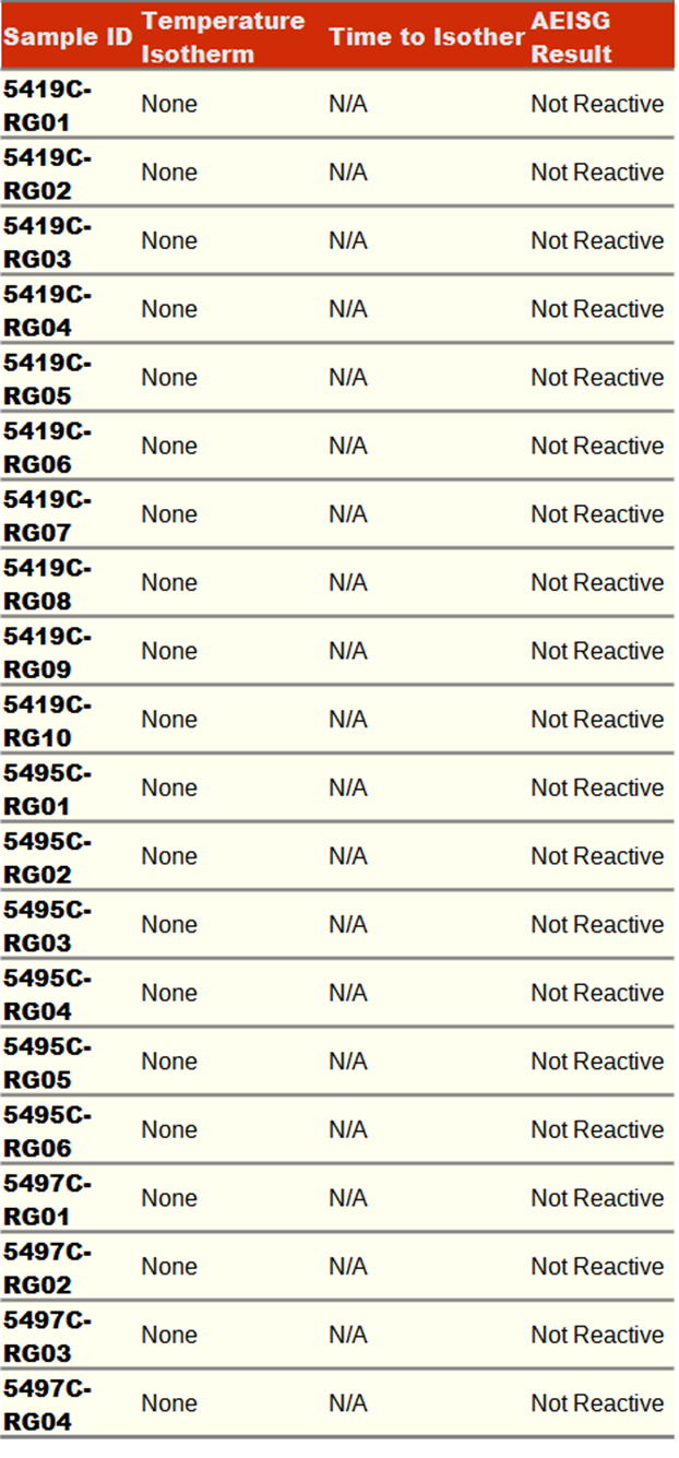 The results for the screening test are shown in Table 1. The AEISG classifies a sample as reactive if it exceeds the background temperature of the sample by 2 degrees centigrade or more throughout the entire test duration. It is difficult to determine if a difference of 2 degrees has occurred during the heating phase of the test. The temperature trace for each sample is studied independently to observe for any evidence of an exothermic reaction. Charts of the sample temperature traces are shown in Appendix A.