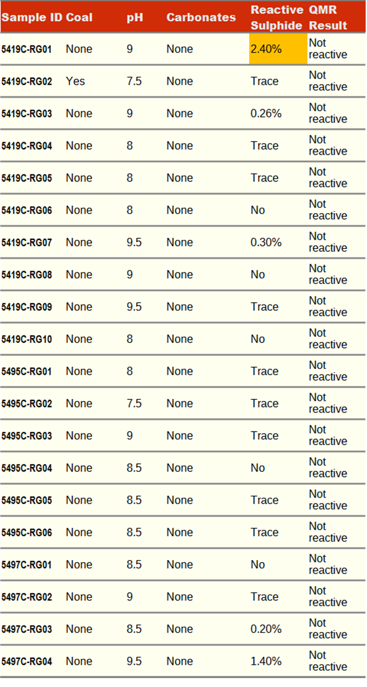 The QMR Test incorporates the role of environmental factors that could impact the reactivity result. Coal and carbonates can act to inhibit the reaction. The pH is measured, as acidity is strongly correlated with reactivity. As the reaction between ammonium nitrate and sulphides is caused primarily reactive sulphides, the presence of reactive sulphides is tested. The results from the QMR Test are listed in Table 2 with only sample 5419C-RG01 containing more than trace reactive sulphide with a pH of 9 inhibiting a reaction.