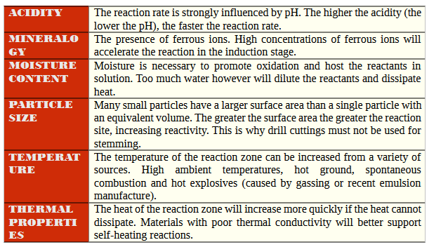 Sulphides are typically present at pyrite, however, can be found in other minerals. In the presence of moisture, pyrite will weather, forming reagent products. Water, as humidity or as a solution, is necessary for the reaction to occur. In a cool dry environment, a reaction between ammonium nitrate prill and pyrite may not occur at all.