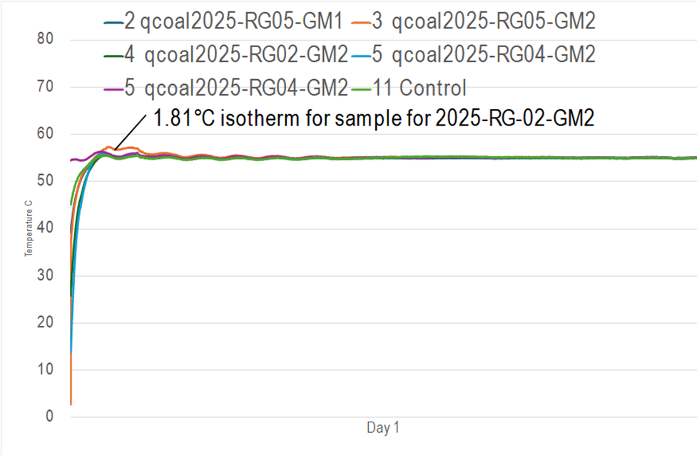 The samples 2025-RG-05-GM2, 2025-RG-05-GM1, 2025-RG-04-GM2 and 2025-RG-02-GM2 contain coal which buffers the AEISG test. It is high risk if this material reaches temperatures exceeding 150°C. Detonators can fire due to temperature and if hydrogen accumulates and then ignites it can cause detonation of the bulk explosive. Inhibited explosives are not able to reduce this risk. The use of inhibited explosive will not prevent this from happening.