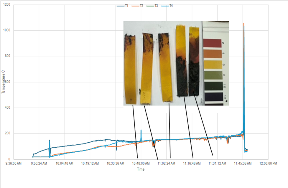 Figure 6 – As ammonia nitrate decomposed the mixture becomes more acidic hence the use of inhibited explosive is not effective to prevent heat and possible detonation. Note temperature due to hydrogen burning is > 1000°C.