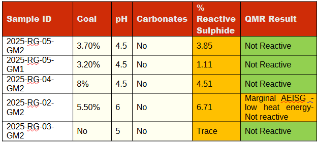 The QMR Test incorporates the role of environmental factors that could impact the reactivity result. Coal and carbonates can act to inhibit the reaction. The pH is measured, as acidity is strongly correlated with reactivity. As the reaction between ammonium nitrate and sulphides is caused primarily reactive sulphides, the presence of reactive sulphides is tested. The results from the QMR Test are listed in Table 2 .