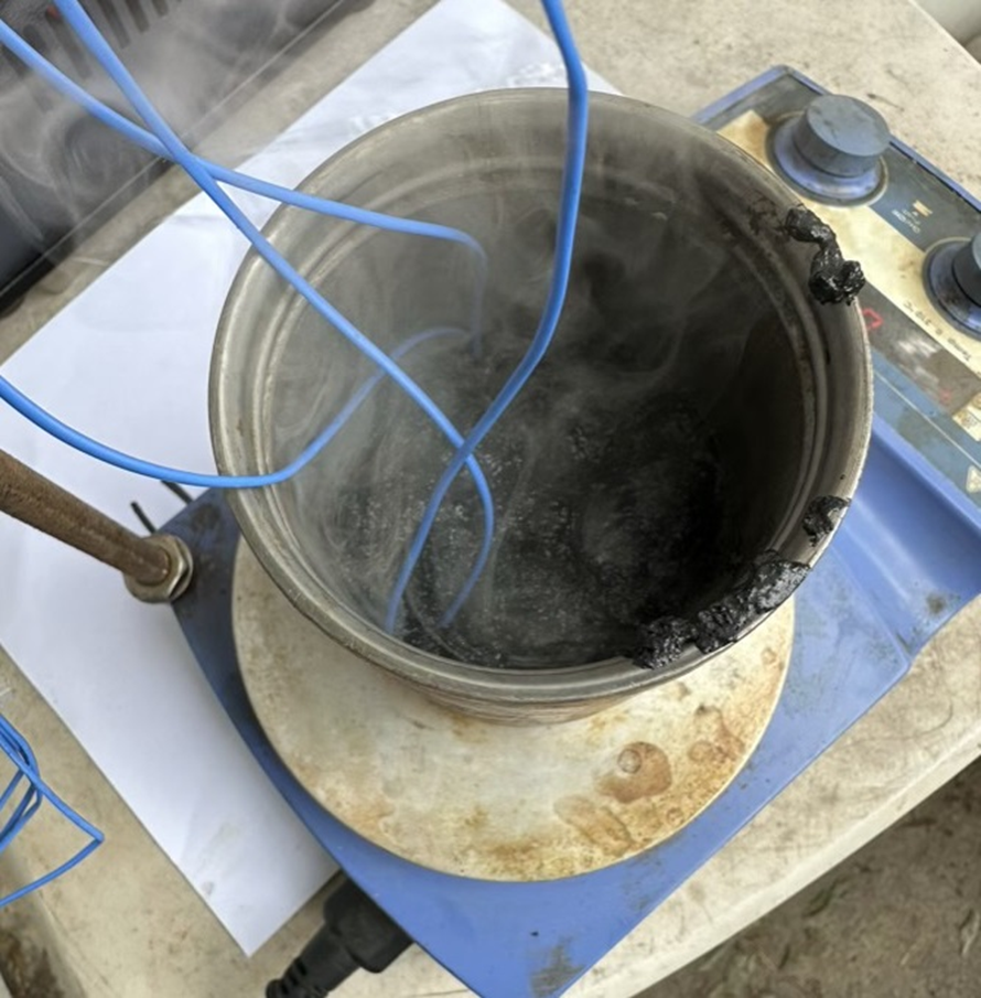 Figure 5 – Mixture placed in a double insulated vessel with the outer layer on the bottom removed and heating on a hotplate at a temperature of 165°C.