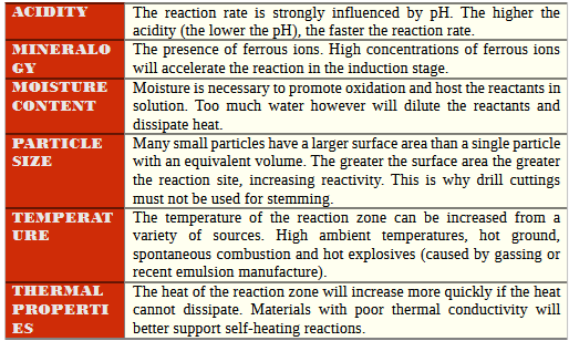 In a mining environment there will be multiple minerals and chemicals that act to inhibit or catalyse the reactivity of ammonium nitrate and sulphides. While water is necessary for the reaction to occur, too much water can dissolve the reactant products and dissipate heat, slowing or preventing the reaction from occurring. It is important to understand the reactions that are taking place to best apply your test results to your site; however, it is prudent from a risk management perspective to assume the worst-case environment and mitigate the risk of a reactive ground event via comprehensive risk management.