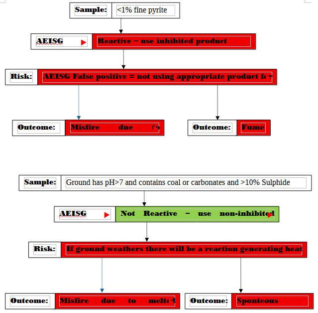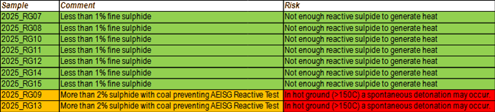 The samples 2025_RG09 and 2025_RG13 contain more than 2% reactive sulphide. It is high risk if this material reaches temperatures exceeding 150°C. Detonators can fire due to temperature and if hydrogen accumulates and then ignites it can cause detonation of the bulk explosive. Inhibited explosives are not able to reduce this risk. The use of inhibited explosive will not prevent this from happening.