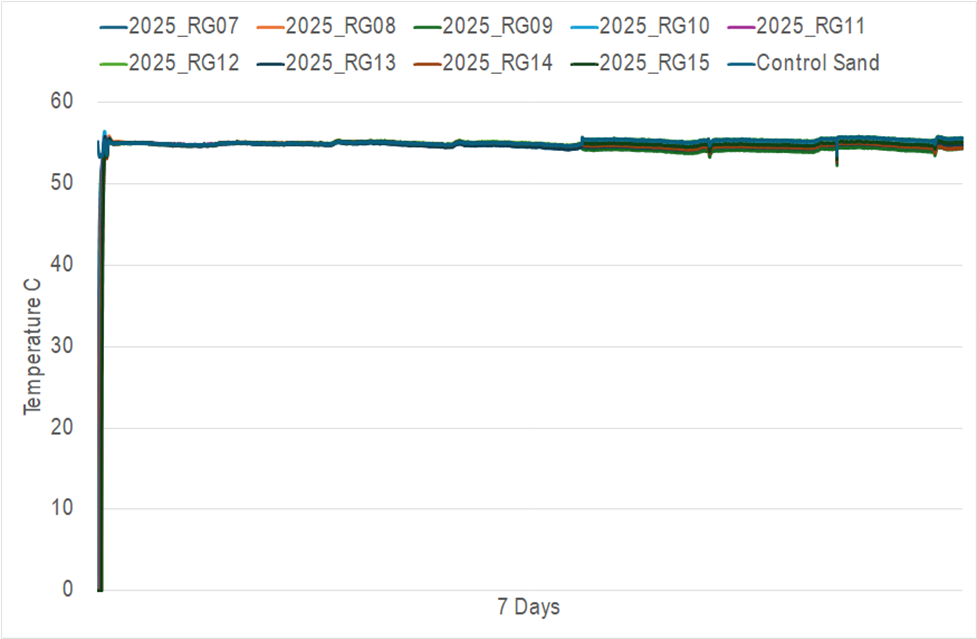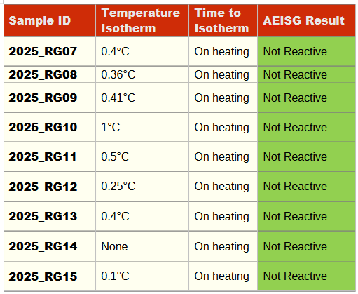 The AEISG classifies a sample as reactive if it exceeds the background temperature of the sample by 2 degrees centigrade or more throughout the entire test duration. It is difficult to determine if a difference of 2 degrees has occurred during the heating phase of the test. The temperature trace for each sample is studied independently to observe for any evidence of an exothermic reaction. Charts of the sample temperature traces are shown in Appendix A.