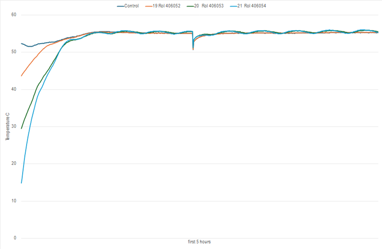 The results for the screening test are shown in Table 1. The AEISG classifies a sample as reactive if it exceeds the background temperature of the sample by 2 degrees centigrade or more throughout the entire test duration. It is difficult to determine if a difference of 2 degrees has occurred during the heating phase of the test. The temperature trace for each sample is studied independently to observe for any evidence of an exothermic reaction. Charts of the sample temperature traces are shown in Appendix A.