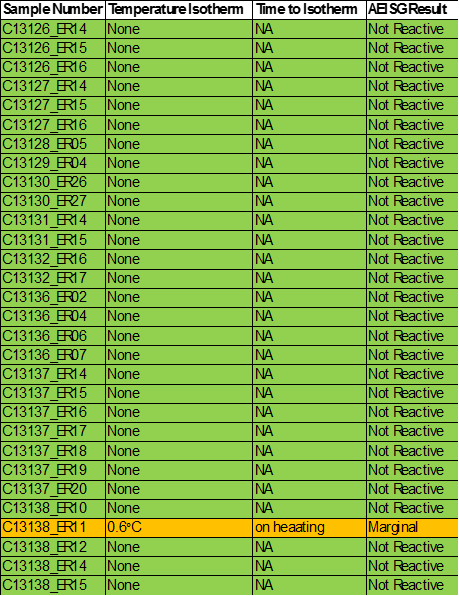 All samples were found to be not reactive when tested as per the AEISG Code of Practice. The QMR test has identified samples C13128_ER05 and C13138_ER10 will become highly reactive if allowed to weather. The QMR test identified Samples C13136_ER06 and C13136_ER07 wll also become reactive if allowed to weather.