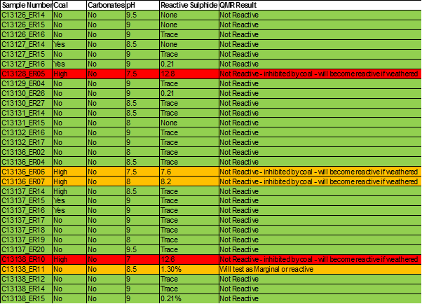 Each sample was assessed for reactivity risk based on pH, carbonate content, reactive sulphide content and coal content using the QMR Reactive Ground Test. Samples C13128_ER05 and C13138_ER10 have more than 12% reactive sulphide but also are mostly coal which inhibits a reaction. Samples C13136_ER06 and C13136_ER07 also have high levels of sulhide and host coal is buffering a reaction. Should these samples become weathered and acidic they will be highly reactive. Blast holes should not be left open for a long period of time and sleep time should be minimised so as to prevent this ground from being weathered. Weathering will cause the oxidation of the pyrite resulting in acidic conditions caused a reaction and may wash away the coal that is currently acting as an inhibiter also causing a reaction