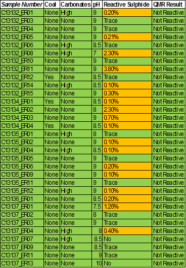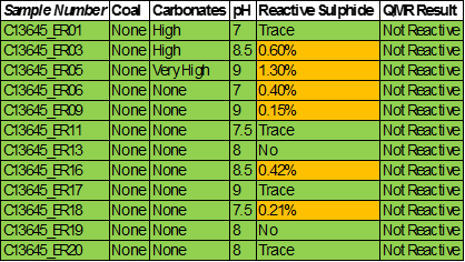 Each sample was assessed for reactivity risk based on pH, carbonate content, reactive sulphide content and coal content using the QMR Reactive Ground Test. Four samples have more than 1% reactive sulphide with a maximum reacive sulphide of 2.3%. These low levels of reactive sulphide will produce limited heat energy should a reaction occur. All samples are alkaline inhibiting a reaction when tested as per the AEISG Code of Practice.