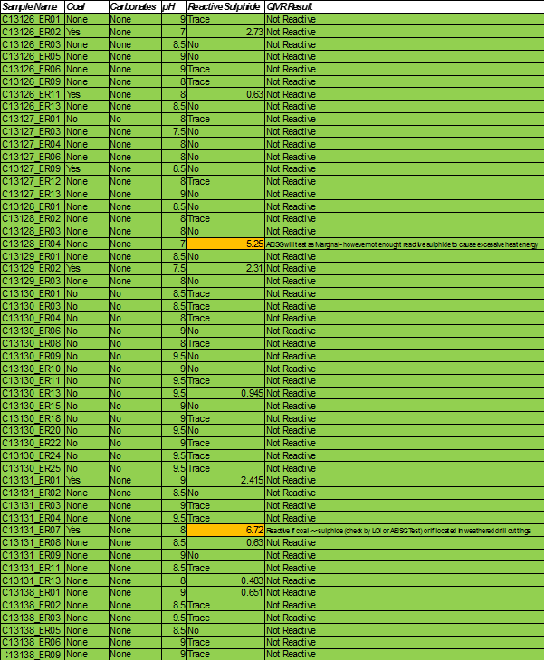 Each sample was assessed for reactivity risk based on pH, carbonate content, reactive sulphide content and coal content using the QMR Reactive Ground Test. Ten samples contained ≥1% reactive sulphide as described in Table 3.
