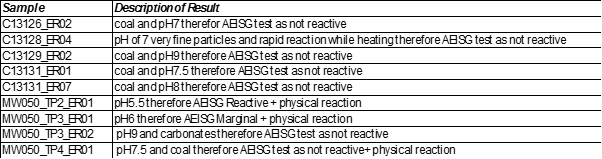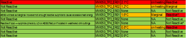 • MW050_TP3_ER01 pH 6 and 2.1% reactive sulphide physical reaction therefore AEISG reactive