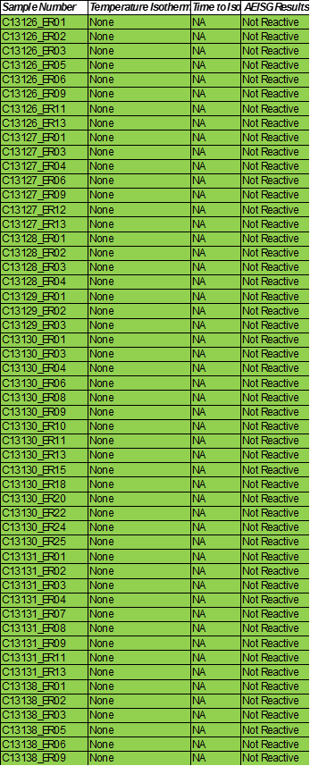 Testing of samples using AEISG code testing for reactivity over a period of 7 days.
