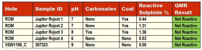 The QMR test identifies the presence of reagents that drives the reactivity, reactive sulphides, and the acidity of the reaction. The presence of common minerals that may react with the reagents or reaction products are also identified, including coal and carbonates. Coal and carbonates can increase the pH resulting in a reduction in the reaction rate. This reduction can range from mild to stopping the reaction entirely. It is important to understand why screening test may return a positive or negative result, as a change in lithologies in different areas of your mine can result in an adverse reactive environment if the presence of minerals that inhibit the reaction are lost.