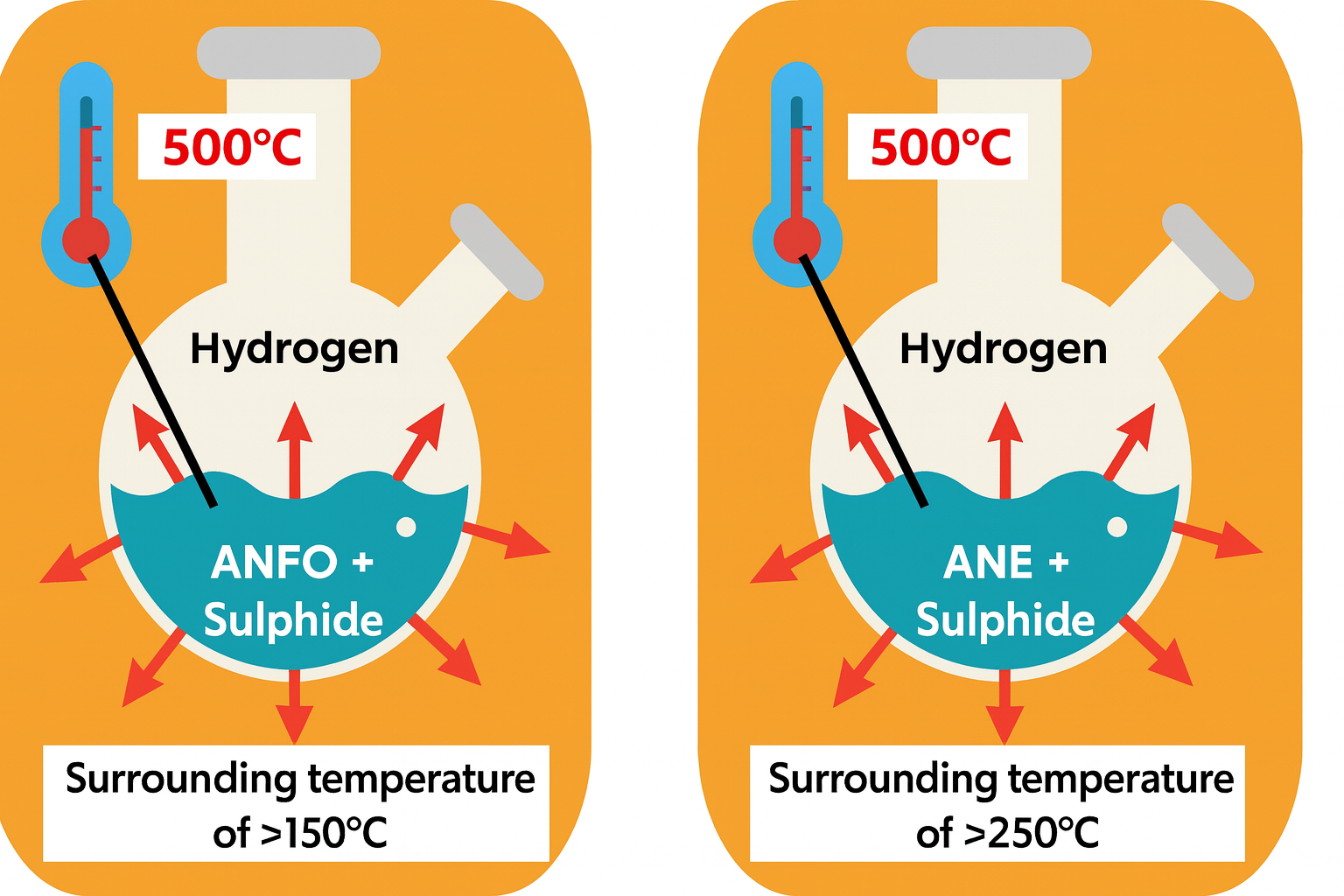 Ground with containing more than 2% reactive sulphide in ground at a temperature of >150°C will produce enough heat to produce hydrogen when ANFO is loaded into the hole. For ammonium nitrate emulsions the ground temperature to produce hydrogen is > 250°C.