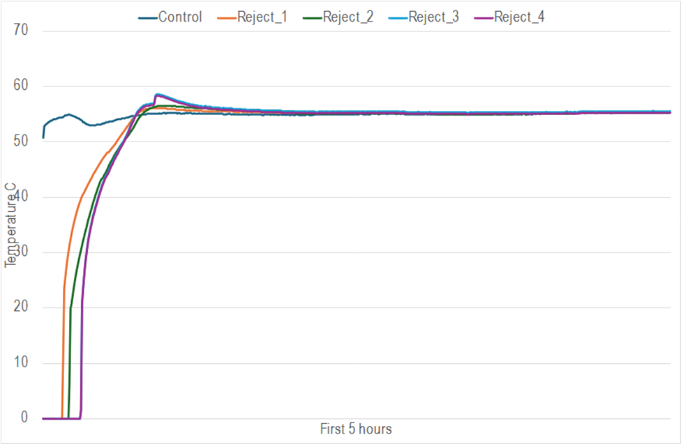The AEISG classifies a sample as reactive if it exceeds the background temperature of the sample by 2 degrees centigrade or more throughout the entire test duration. It is difficult to determine if a difference of 2 degrees has occurred during the heating phase of the test. The temperature trace for each sample is studied independently to observe for any evidence of an exothermic reaction. Charts of the sample temperature traces are shown in Appendix A. Tables 1 identifies that Jupiter Reject Sample 4 is marginal. Because the temperature isotherm is at the upper limit of AEISG marginal (i.e. 2°C) it was retested an additional 2 times with the average temperature isotherm just less than the limit for reactivity.