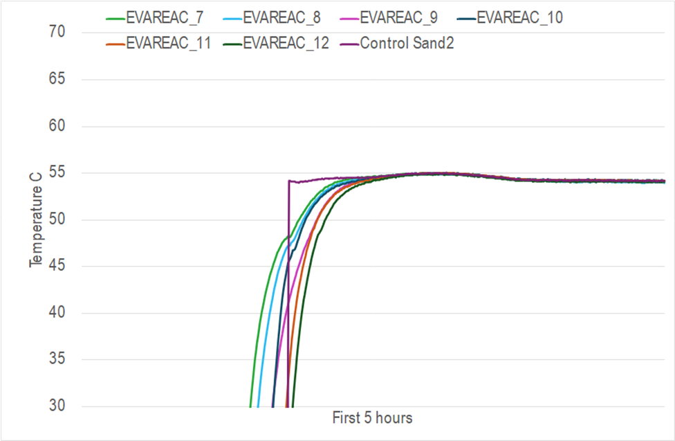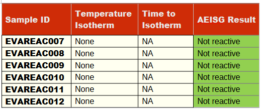The AEISG classifies a sample as reactive if it exceeds the background temperature of the sample by 2 degrees centigrade or more throughout the entire test duration. It is difficult to determine if a difference of 2 degrees has occurred during the heating phase of the test. The temperature trace for each sample is studied independently to observe for any evidence of an exothermic reaction. Charts of the sample temperature traces are shown in Appendix A.