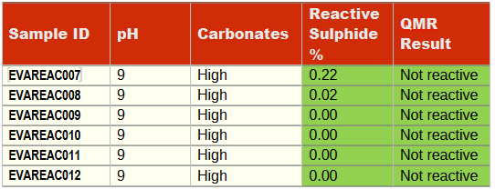 The results from the QMR Test indicate all samples are alkaline and all sample contains a high level carbonates. All samples contain less than 1% reactive sulphide and no fine-grained sulphide was observed. All these factors prevent reactivity.